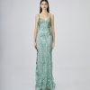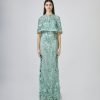 Vestido largo ajustado de estampado floral de lentejuela. Escote corazón de tirante fino, espalda descubierta y cuerpo encorsetado. Falda ligeramente en línea sirena. Cierre en espalda con cinta corchetera y cremallera invisible. Incluye capa.